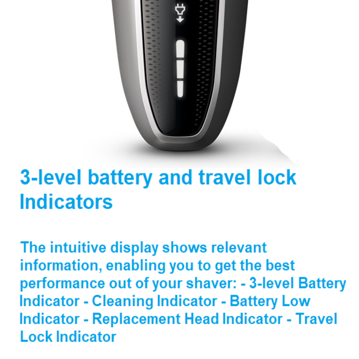 - Trên thân máy cạo râu tích hợp 3 mức đèn hiện thị rõ ràng giúp người dùng nắm được tình trạng chính xác của máy để có thể sử dụng một cách hiệu quả nhất gồm có: 3 mức pin chỉ báo và đèn báo khóa.