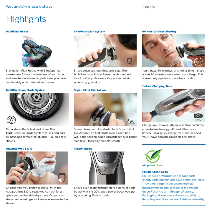 - Chọn cách cạo râu bạn thích. Với đầu bịt Khô & Ướt Aquatec, bạn có thể chọn cạo khô nhanh và thoải mái. Hoặc bạn có thể cạo ướt với kem cạo râu hay bọt cạo râu, kể cả khi tắm. Cạo qua những phần râu rậm rạp với sức mạnh nhiều hơn 20% - Cạo nhanh hơn qua những phần râu rậm rạp với khả năng tăng thêm 20% sức mạnh khi kích hoạt chế độ Turbo. Đầu cạo linh hoạt theo 5 hướng để cạo nhanh và sát