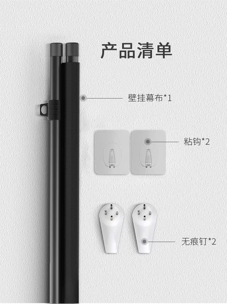 - 100 inch Kích thước 216 x 122cm Dài hộp 229cm Thiết kế tối giản, gọn nhẹ, dễ dàng lắp đặt bằng móc treo, tiện lợi cuộn lên – thả xuống bằng tay. Linh hoạt sử dụng cho nhiều không gian: phòng khách, lớp học, văn phòng nhỏ, sân vườn,... Có tặng kèm 2 bộ móc treo như hình (Để ở đầu màn có đánh dấu) Kết hợp hoàn hảo với máy chiếu mini cho nhu cầu giải trí tại gia, học tập hay trình chiếu nhóm nhỏ. Chất liệu cao cấp: Vải trắng 3 lớp matte white giúp hình ảnh rõ nét, hỗ trợ nội dung 2D, 3D, Full HD đến 4K. Mặt sau phủ PVC đen giúp chống xuyên sáng, tăng độ tương phản, tái hiện màu sắc trung thực, sắc nét. Góc nhìn rộng đến 150° – cho hình ảnh đồng đều dù ngồi ở vị trí nào. Phù hợp nhiều nhu cầu khác nhau Bảo hành 1 năm chính hãng