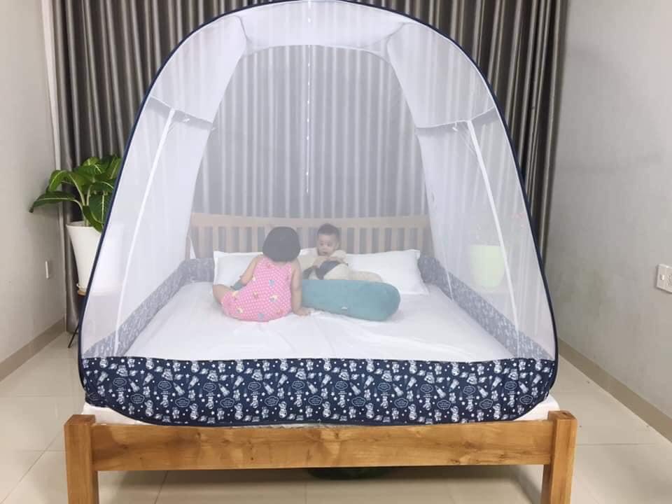 Kiểu dáng: Đỉnh rộng, có 2 cửa ra vào,  có viền chân là từ vải nylon thay vì lưới mùng ( giúp bảo vệ 100% khi để tay chân chạm sát mùng)