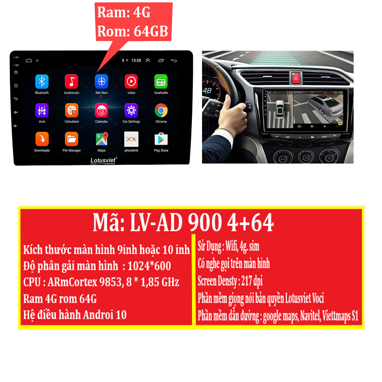 Màn hình DVD Android cao cấp Wifi, 4G dùng cho tất cả các loại xe ô tô Ram 4G Rom 64G - Hàng Chính Hãng - Mã: LV–AD900 4+64 Màn hình DVD android ô tô