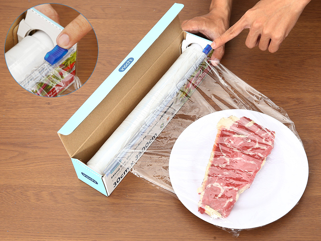 Sản phẩm có hộp kèm lưỡi dao cắt, bạn dễ dàng cắt đúng lượng màng bọc cần sử dụng mà không mất quá nhiều thời gian. Màng bọc được thiết kế kích thước phù hợp với bát, đĩa, tô thường dùng trong gia đình. Ngoài ra, hộp có cuộn nhỏ gọn, bạn thuận tiện mang theo khi đi du lịch xa, mang theo thực phẩm mà không lo ngại gì.