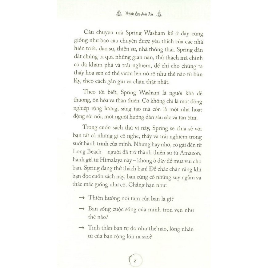 Trong cuốn sách thú vị này, Spring dẫn dắt chúng ta qua những gian nan, thử thách mà chính cô đã khám phá và trải nghiệm, để chỉ cho chúng ta thấy hoa sen có thể vươn lên, nở rộ như thế nào từ bùn lầy theo cách gần gũi và chân thật nhất.