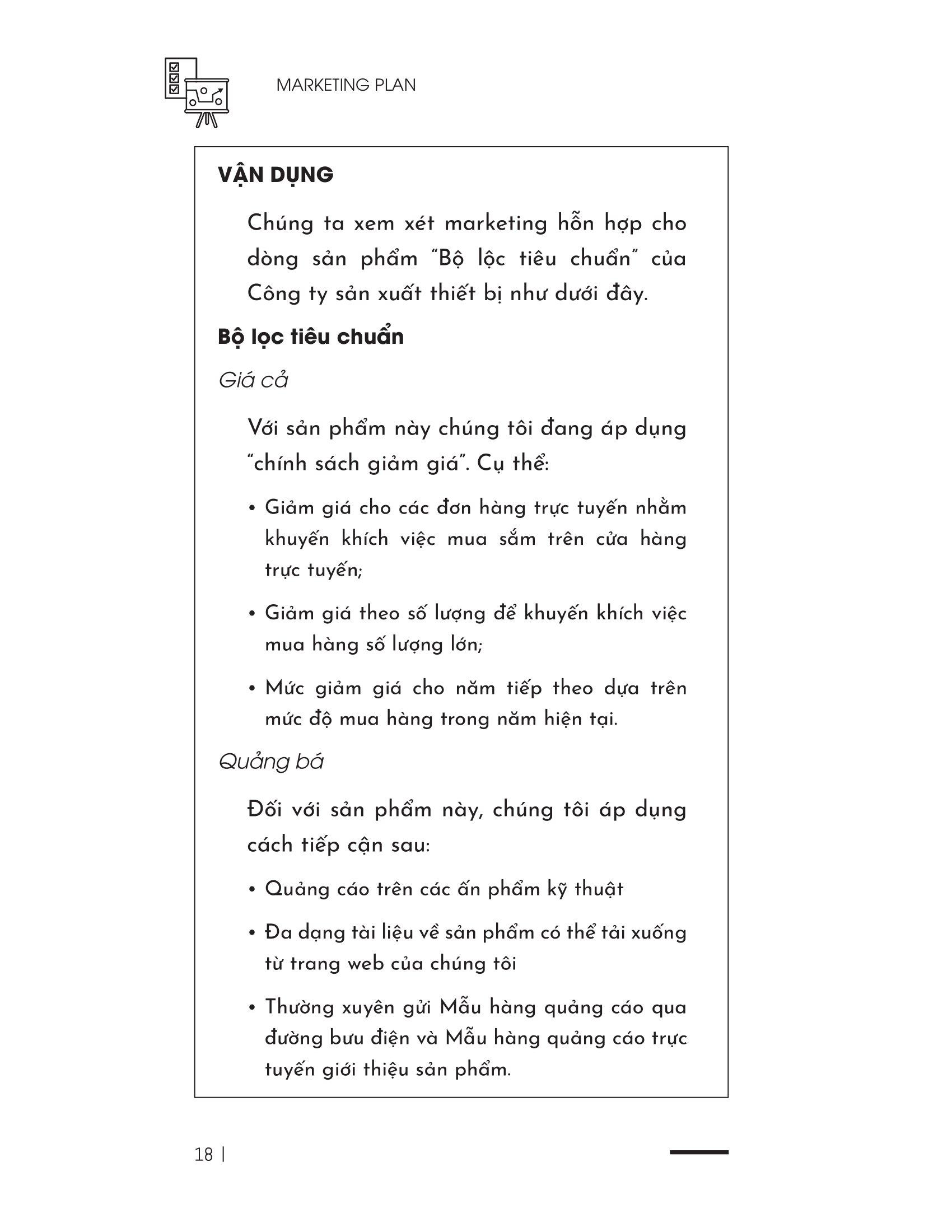 Trong sách còn có các bài tập thực tế, các bảng mẫu hữu ích và các mẹo hàng đầu để giúp bạn phát triển kỹ năng kinh doanh quan trọng này. Bạn cũng nhận được lời khuyên thiết thực về cách lập kế hoạch và điền vào mọi phần của tài liệu kế hoạch marketing. “Marketing Plan” là cuốn sách cần thiết cho bất cứ ai muốn thúc đẩy sản phẩm hoặc doanh nghiệp của họ.