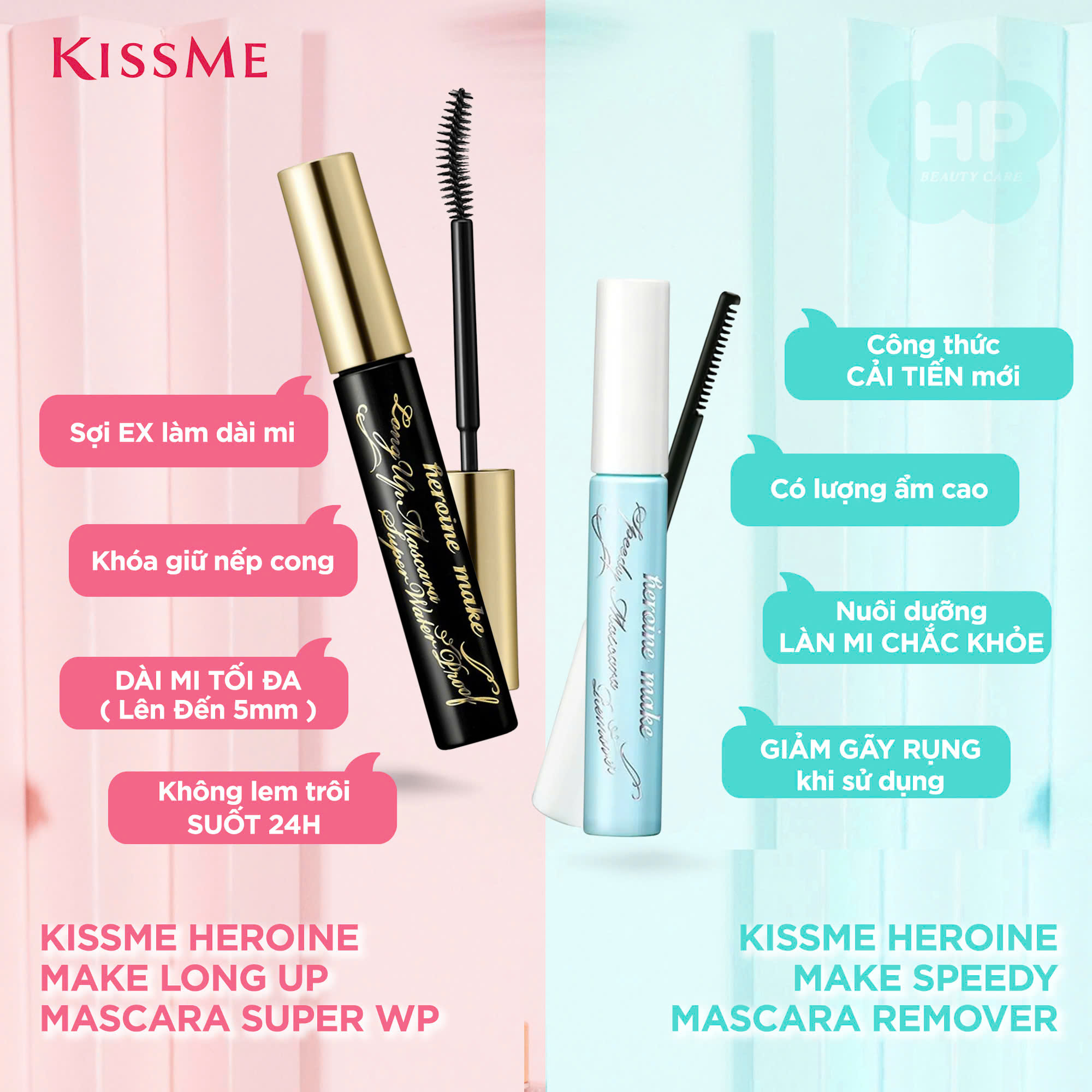 Mascara Kissme Heroine Make Long Up Mascara Super   Giúp Nâng Cong Và Dài Mi Tối Đa Chống Trôi Siêu Bền 6g Thông tin sản phẩm: Số Lô: In trên sản phẩm Xuất Xứ: Nhật Bản Khối lượng tịnh: 6g HSD: 5 năm kể từ ngày sản xuất Mascara màu đen tuyền có chất mực được chiết xuất từ Nhân sân Panax, Sữa ong chúa, Hoa trà, Nụ tầm xuân, “SỢI POLYMER EX LÀM DÀI“, thành phần “KHOÁ GIỮ NẾP CONG” tạo phồng rậm làn mi, giúp từng sợi mi được làm dài, nâng cong làn mi và ngay lập tức giúp Khóa giữ Nếp Cong cả ngày. Ngoài ra còn cung cấp dưỡng chất dưỡng làn mi, tránh tình trạng cay mắt, rụng mi, nhăn vùng mí mắt khi sử dụng. Đặc biệt Đầu chải Mascara siêu mịn giúp chống cọ sát, gây khó chịu khi sử dụng. Tuy độ bám siêu bền, không trôi nhưng lại Dễ dàng rửa sạch bằng nước ấm (35-38 Độ) 1/ Công dụng: