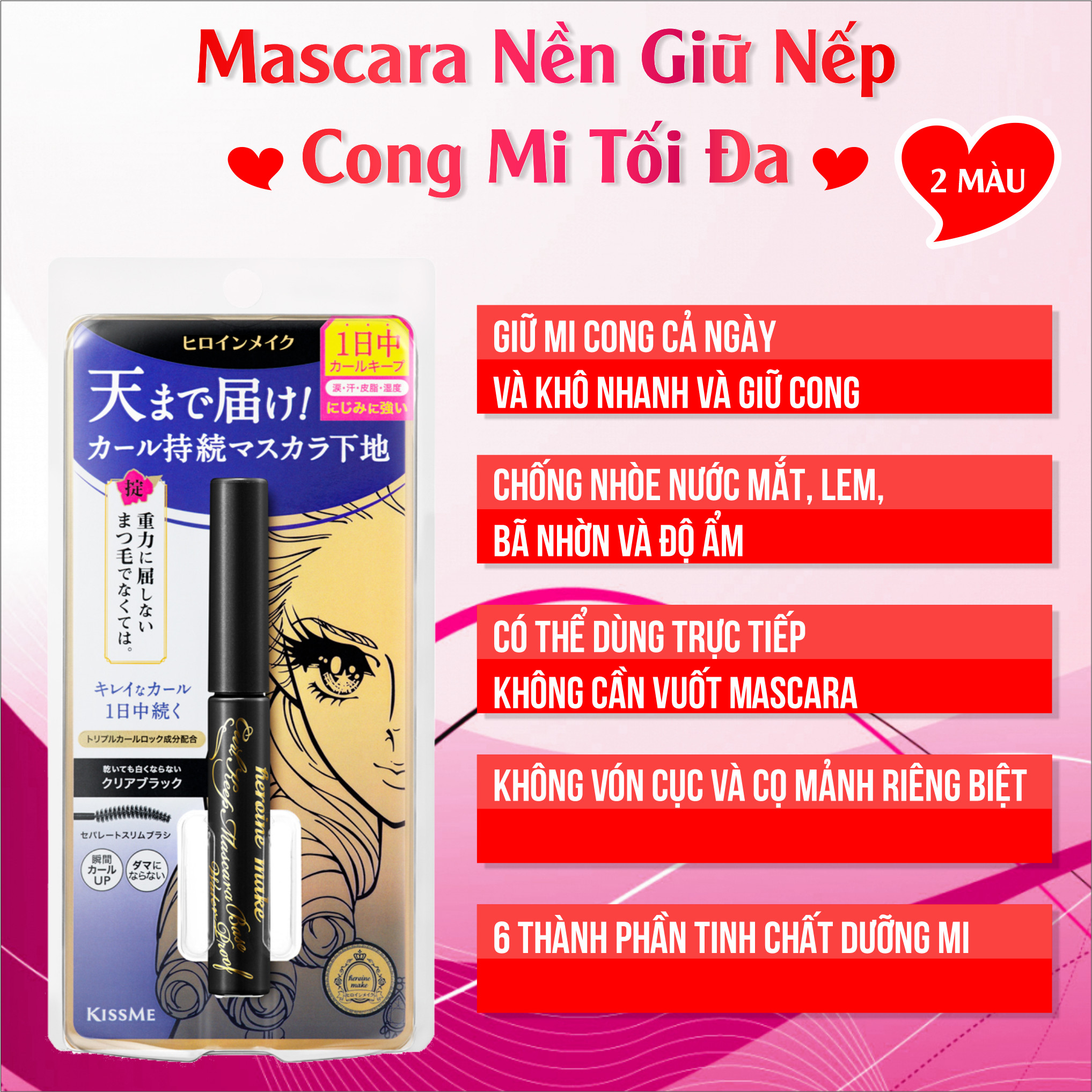 Mascara Lót Nền Siêu Nâng Cong Mi Dạng Màng Film Chống Trôi Siêu Bền Trong 24h Kissme Heroine Make Curl Keep Mascara Base   Thông tin sản phẩm: Số Lô: In trên sản phẩm Thương hiệu: Kissme Xuất Xứ: Nhật Bản Khối lượng tịnh : 4.5 g HSD: 5 năm kể từ ngày sản xuất   Mascara có chất mực được chiết xuất từ Sữa ong chúa, Dầu Hoa trà, Nụ tầm xuân, Dầu Argan... thành phần “GIỮ NẾP CONG” Trimethylsiloxysilicat, chải mãnh riêng biệt có thể dễ dàng Vuốt từ gốc mi Đồng thời ngăn ngừa Vón Cục và Tách từng sợi mi nâng cong làn mi và ngay lập tức giúp Khóa giữ Nếp Cong cả ngày. Ngoài ra còn cung cấp dưỡng chất dưỡng làn mi, tránh tình trạng cay mắt, rụng mi, nhăn vùng mí mắt khi sử dụng. Đặc biệt. Tuy độ bám siêu bền, không trôi nhưng lại Dễ dàng rửa sạch bằng nước ấm (35-38 Độ)   1/ Công dụng: