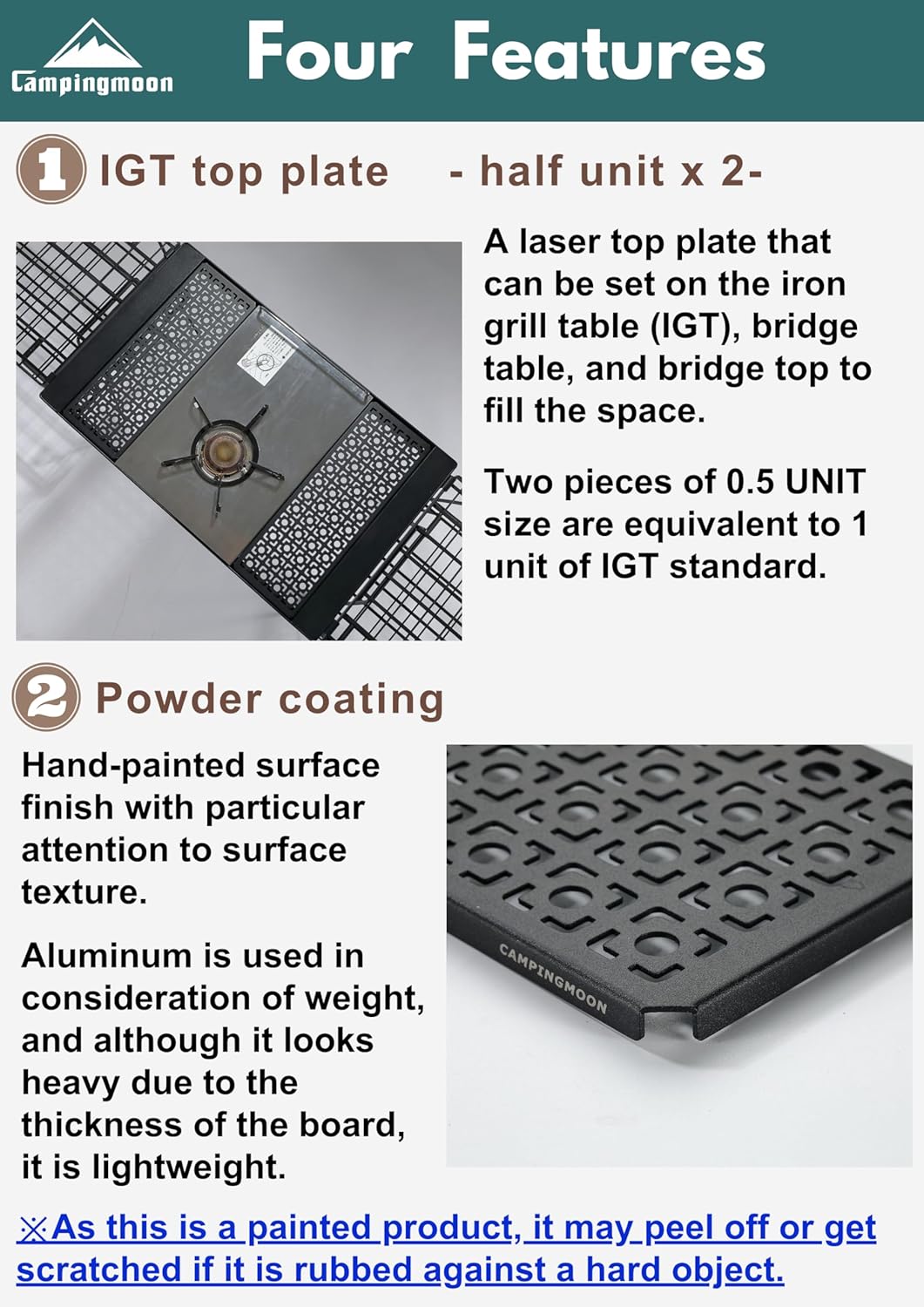 Mặt bàn nhôm một phần hai có họa tiết Campingmoon IGT CK-12F-2P được khắc bằng laser với họa tiết hiện đại có thể sử dụng trên bàn nướng, kệ CK-2, khung bàn IGT Campingmoon CK-3650-T38. Hai tấm nhôm này tương đương với một đơn vị tiêu chuẩn IGT nên cũng có thể được sử dụng để lấp đầy khoảng trống của các sản phẩm kệ sắt (IGT) khác.