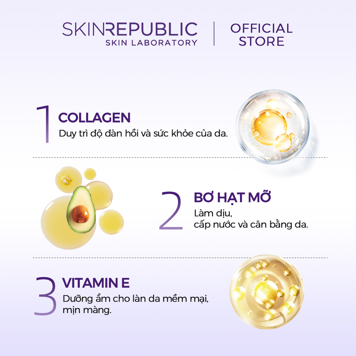 - Collagen Thành phần quan trọng cho làn da khỏe mạnh. - Collagen duy trì độ đàn hồi và sức mạnh của da bằng cách kích thích tổng hợp collagen mới và kết quả là giảm thiểu sự xuất hiện của các nếp nhăn sâu.
