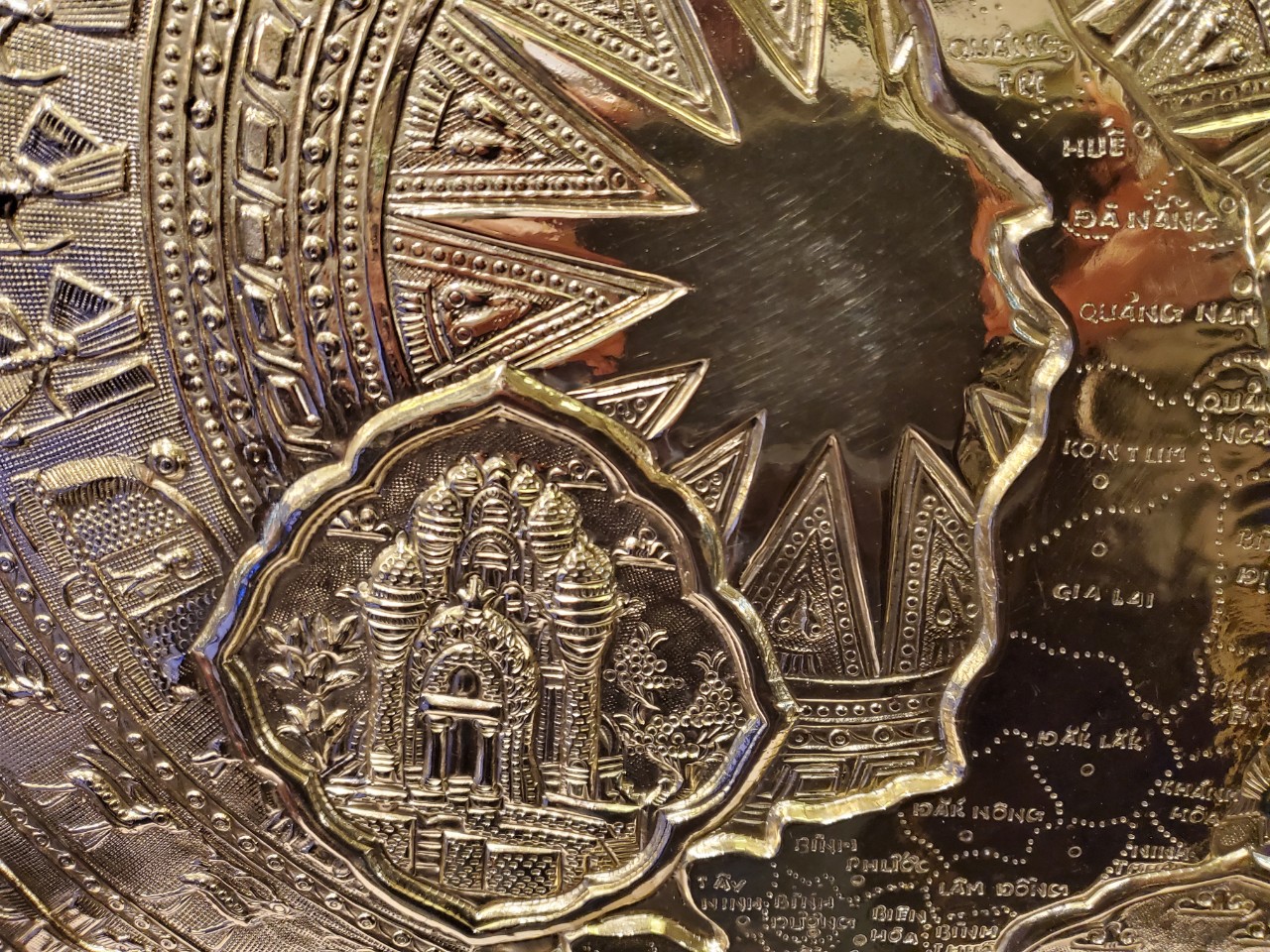 Mua tại TiktokMặt trống đồng hình bản đồ Việt Nam có họa tiết cảnh 3 miền Bắc , Trung , Nam được thúc gò nổi bằng đồng vàng nguyên chất liền khối.