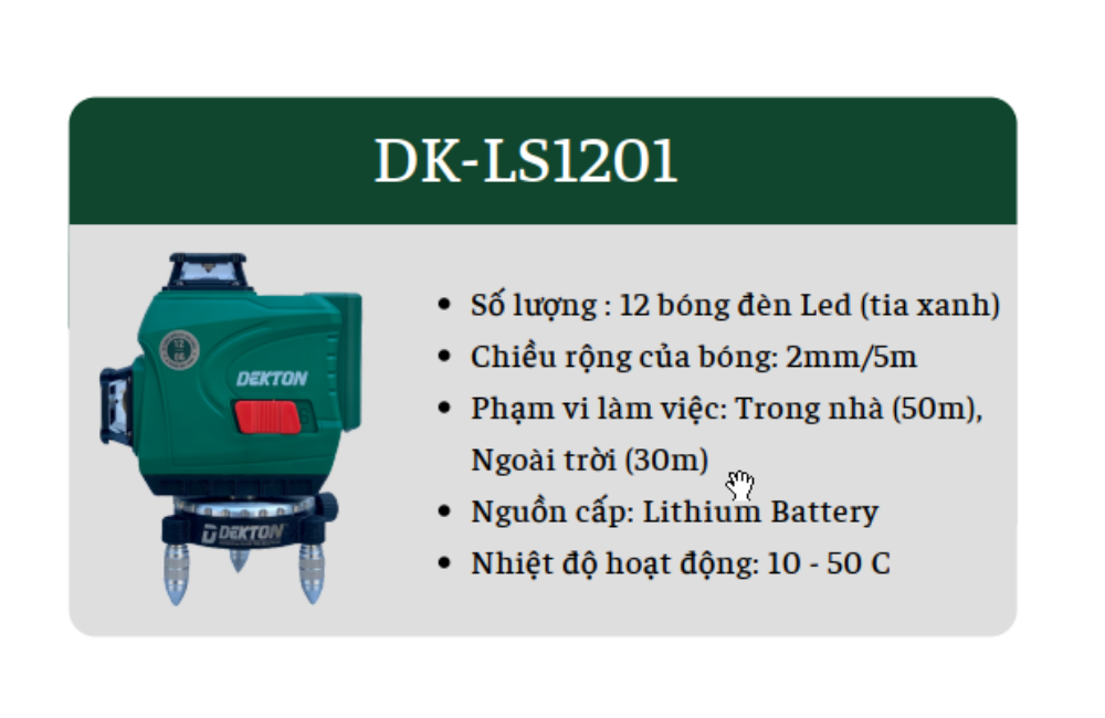 Với máy cân bằng laser 12 tia Dekton DK-LS1201, bạn có một công cụ chất lượng cao, đáng tin cậy và an toàn để thực hiện các công việc cân bằng và định vị. Thương hiệu Dekton và xuất xứ từ Trung Quốc đảm bảo chất lượng và hiệu suất của máy.