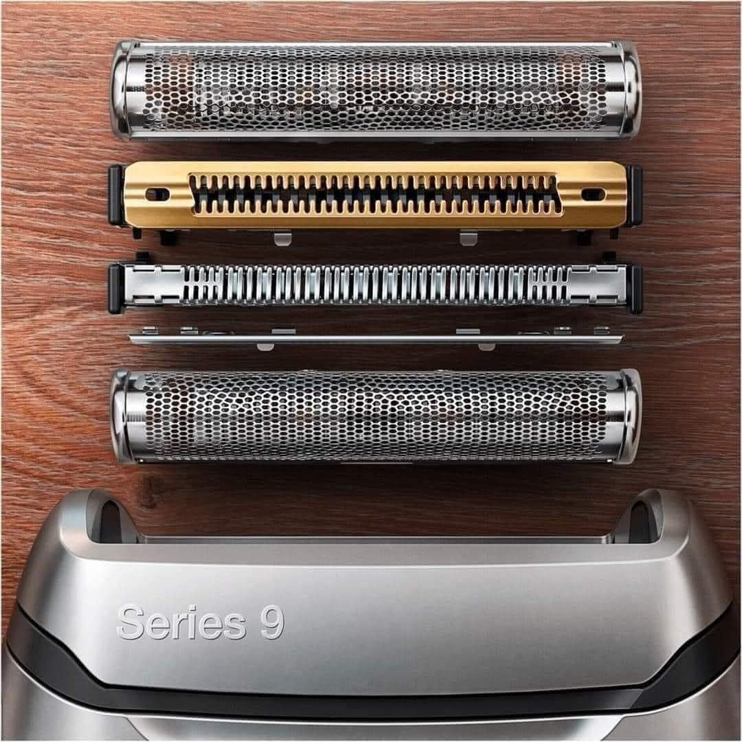 – Lưỡi cạo trên Braun series 9 là loại 5 lưỡi lồng vào nhau, hoạt động đồng thời cả 5 lưỡi khi máy chạy, điểm khác biệt lớn nhất trên lưỡi cạo series 9 với với các model đàn em Series 7- Series 8… là được trang bị thêm 1 lưỡi titan (màu vàng như hình), có tác dụng cạo cắt những sợi râu ngủ, râu cong, râu nằm là là trên bề mặt da chỉ với 1 lần di máy.