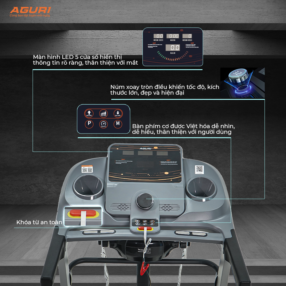 Máy chạy bộ AGT-117LE AGURI *Thông tin sản phẩm. - Motor DC công suất 3.0HP - Màn hình LED 6 cửa số  hiển thị: thời gian, quãng đường, vận tốc, nhịp tim, calories, chương trình