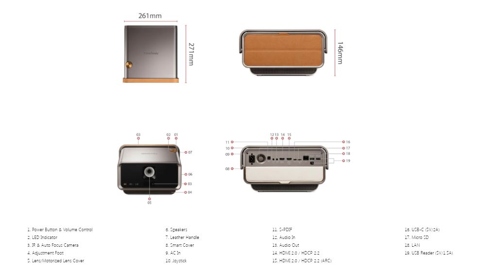 • Cổng kết nối: HDMI: 2 (HDMI 2.0, HDCP 1.4/2.2), SD Card: Micro SD (256GB, SDXC), USB Type C: 1 (5V/ 2A), USB Type A: 2(USB2.0 Reader x2), RJ45 x 1,(Internet & Alexa control)Wifi Input: 1 (5Gn), Bluetooth Input: 1 (BT4.2), Audio out (3.5mm): 1, Audio-out (HDMI ARC): 1(Share with HDMI Input), S/PDIF: 1, USB Type A (Power): 2 (USB2.0 - 5V/1.5A x2, share with USB A Input)