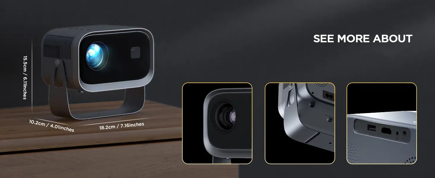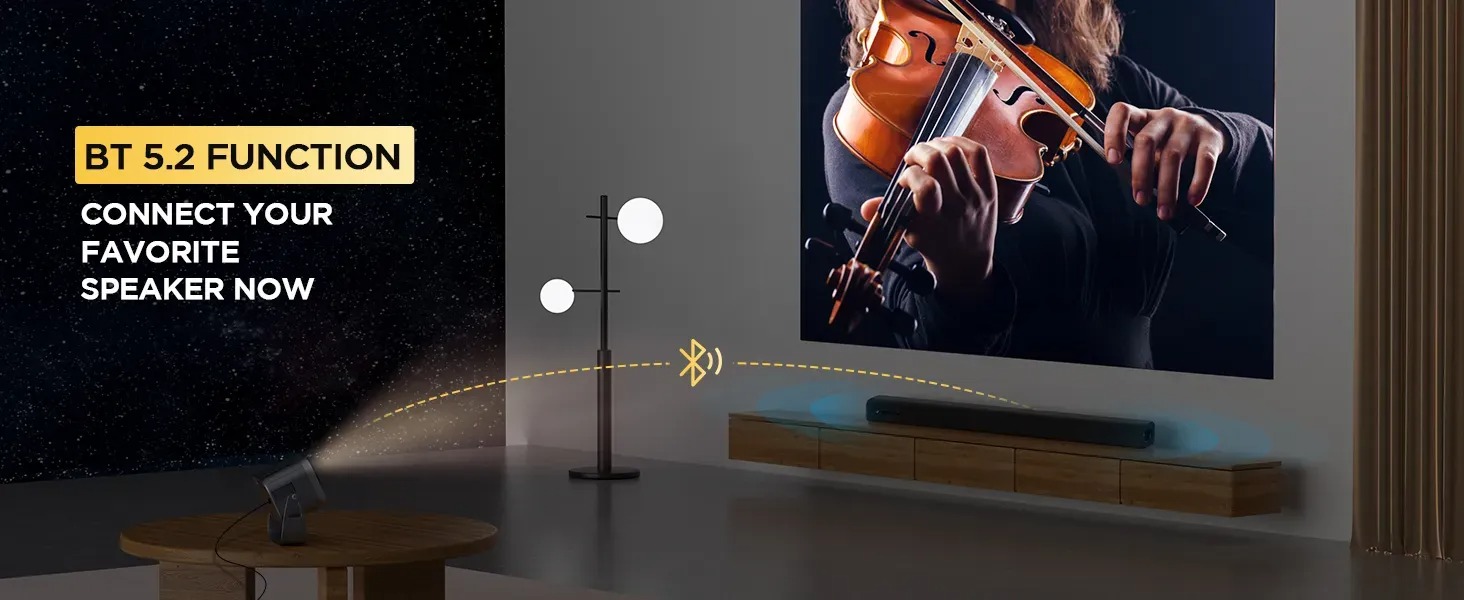 Máy chiếu android có điều khiển cử chỉ giọng nói tiếng việt, Bluetooth, loa kết nối màng hình điện thoại, Wifi kép 2 băng tần, cài sẵn ứng dụng tivi truyền hình cáp bóng đá và phim HD miễn phí vĩnh viễn