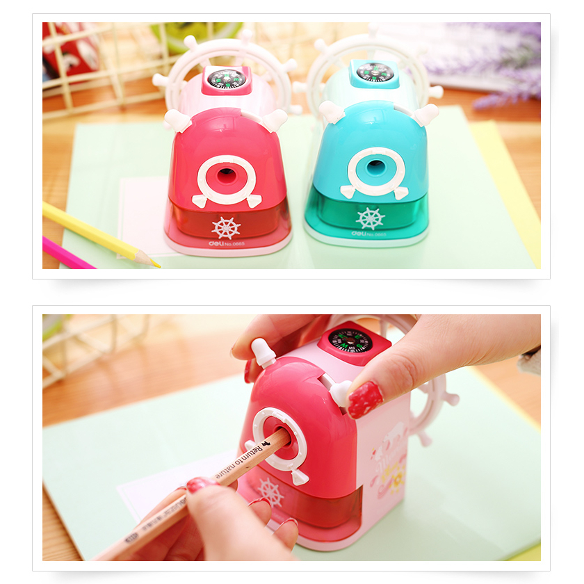 Máy Chuốt Bút Chì Deli 665 tạo ấn tượng, thu hút các bé bởi thiết kế vỏ hình vô lăng tàu thủy dễ thương, màu xanh tươi sáng. Đây là kiểu máy chuốt bút chì quay tay dễ sử dụng, an toàn cho trẻ. Lưỡi dao kim loại sắc bén, không hoen gỉ. Vỏ máy bằng nhựa PP cao cấp, không độc hại, độ bền cao.