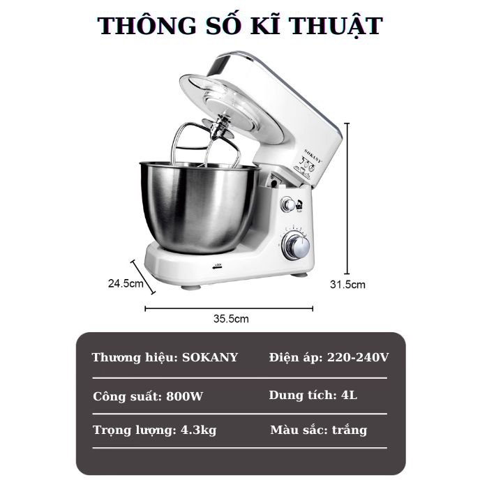 THÔNG SỐ KỸ THUẬT CỦA MÁY ĐÁNH TRỨNG TRỘN BỘT ĐỂ BÀN SOKANY: - Thương hiệu: SOKANY - Model: SC-209 - Công suất: 800W - Điện áp: 220-240V - Tần suất: 50/60Hz - Dung tích: