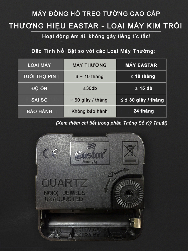 - Máy đồng hồ Treo tường Eastar Kim trôi Độ chính xác cao (≤± 30 giây/tháng), hoạt động ổn định, chính xác, êm ái, không gây bất kỳ tiếng tíc tắc nào khi hoạt động.