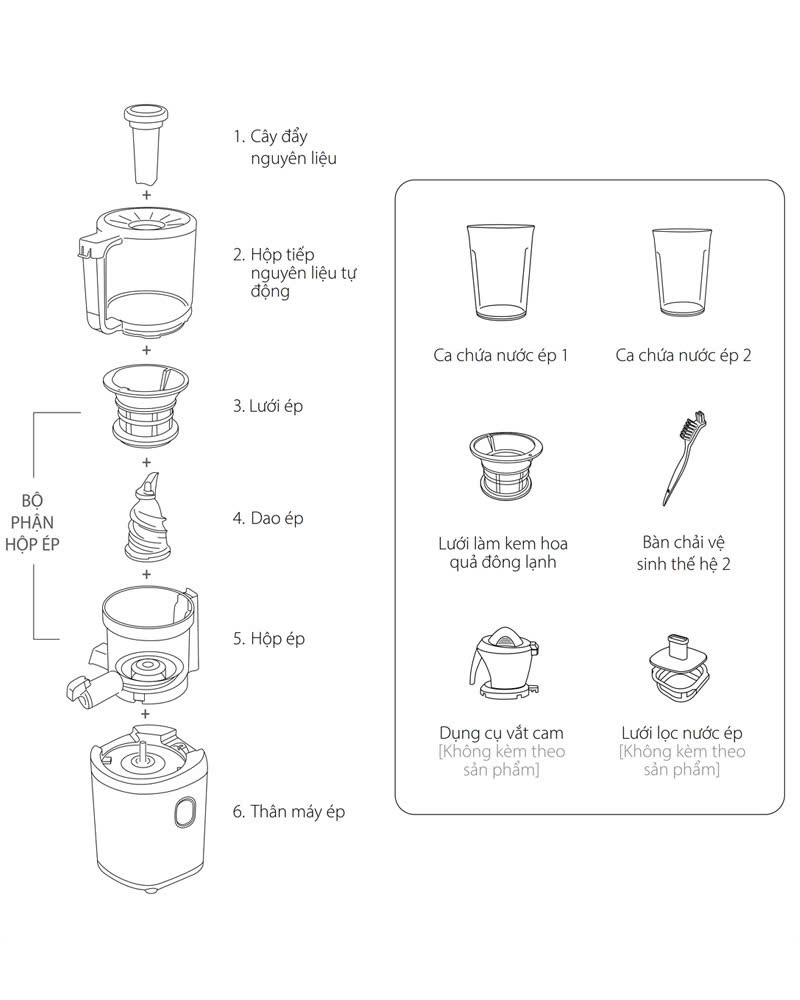 Phương pháp ép chậm, nhẹ nhàng ép các nguyên liệu để giảm thiểu nhiệt sinh ra từ ma sát, cung cấp nước ép tươi, nguyên chất với các chất dinh dưỡng của nguyên liệu được giữ lại như ban đầu. Bắt đầu ngày mới của bạn một cách lành mạnh với nước ép nguyên chất, giữ nguyên hương vị, màu sắc ban đầu của các nguyên liệu!