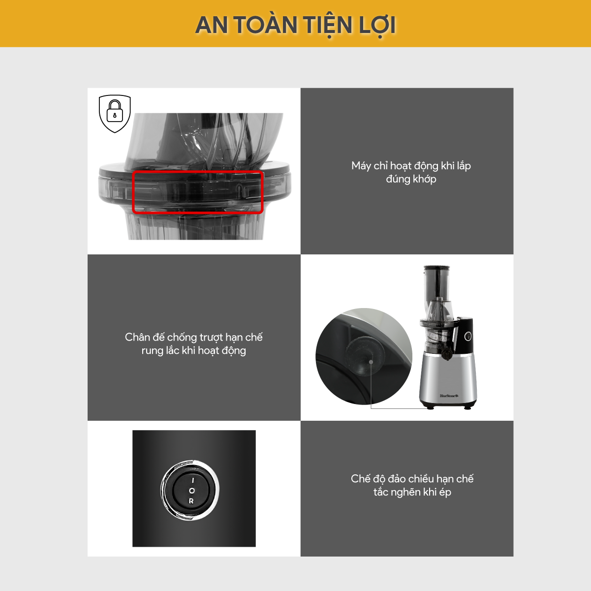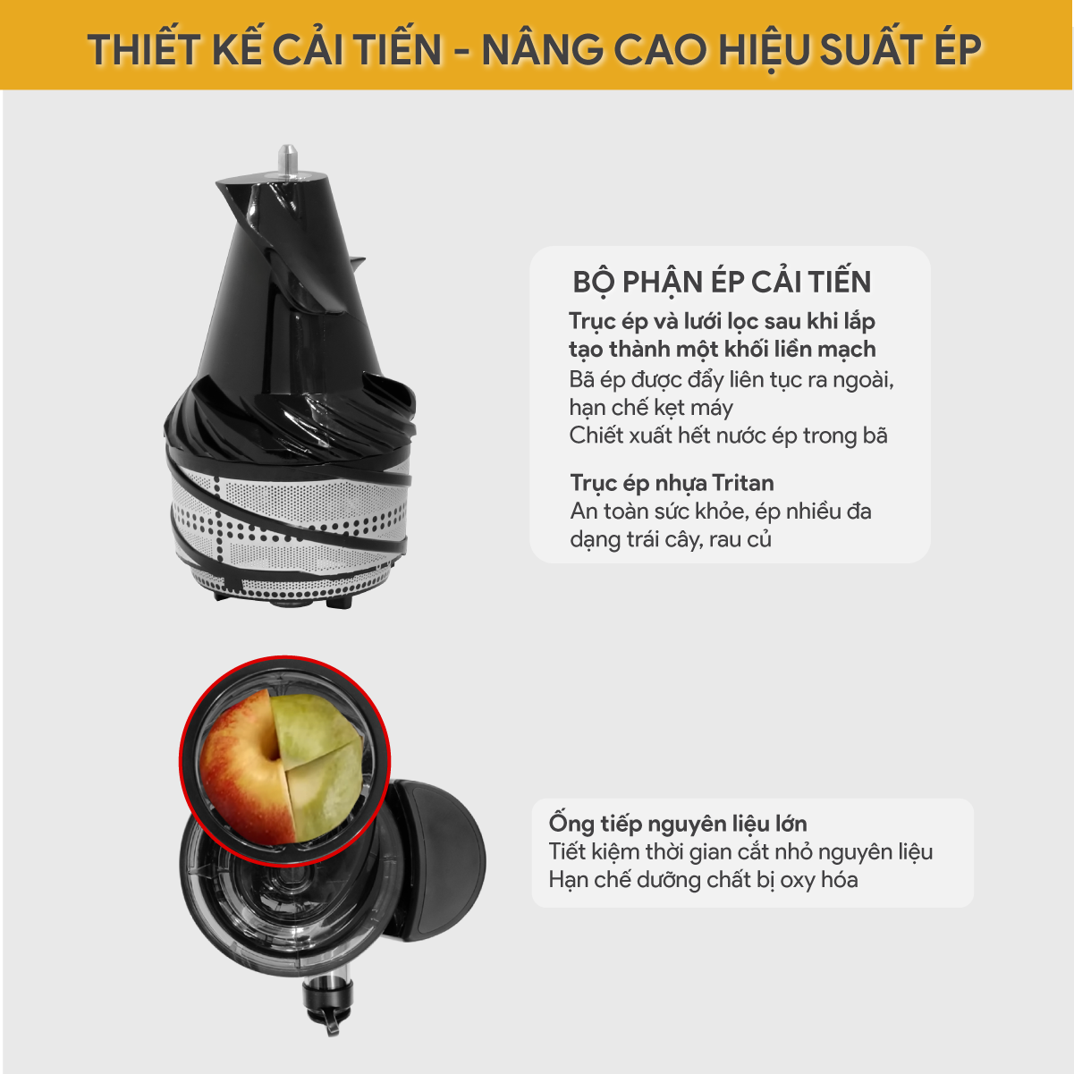 • Thiết kế rãnh nhỏ mặt trong khay chứa nước ép, giảm ma sát sinh nhiệt, hỗ trợ lưu giữ chất dinh dưỡng từ thực phẩm.
