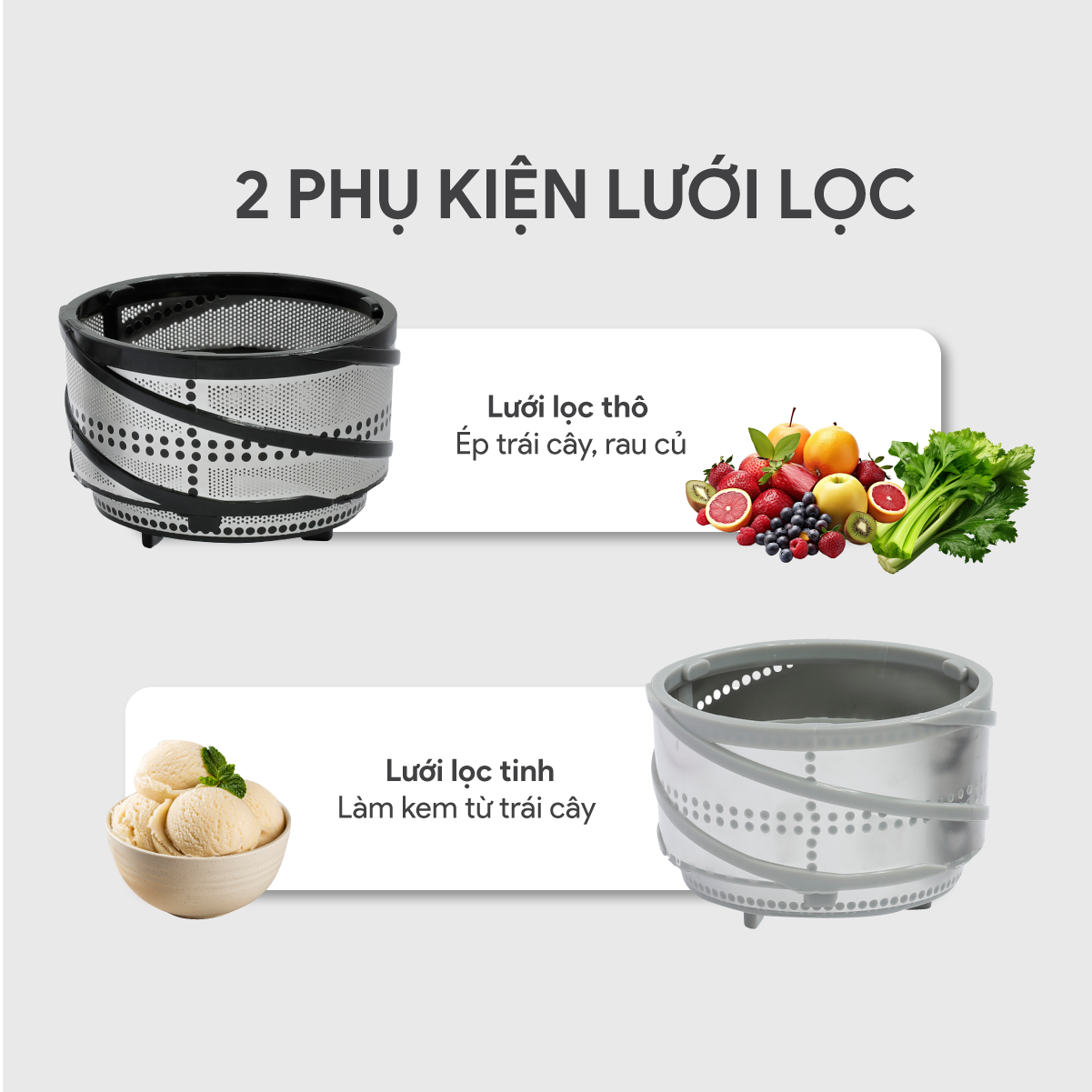 • Khoảng cách giữa lưới lọc và thành cối rất nhỏ, tận dụng tối đa lực ép giữ bã di chuyến trên thành khay chứa, tách biệt với nước ép. Đồng thời, hạn chế giữ bã bên trong khay chứa, ép kiệt bã hiệu quả