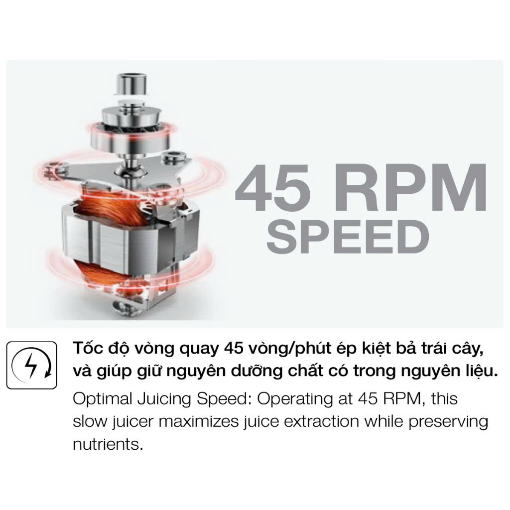 ƯU ĐIỂM SẢN PHẨM: - Động cơ 100% bằng đồng mạnh mẽ và bền bỉ - Công suất cực lớn 250W giúp nghiền nát các nguyên liệu cứng - Tốc độ ép