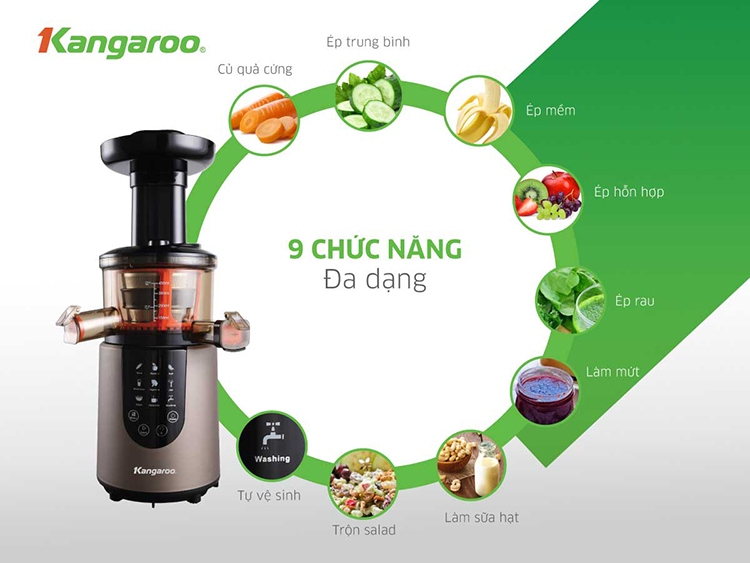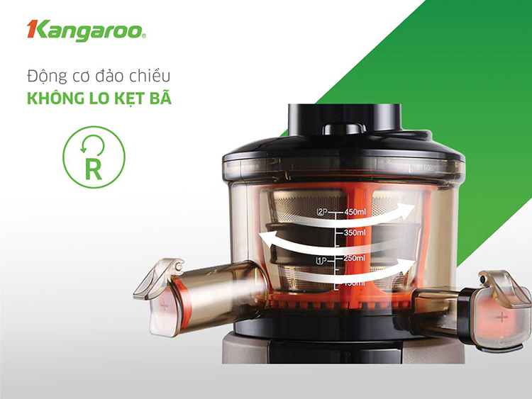 Kangaroo KG180SJD hội tụ đủ những công năng tiện ích nhất cho người dùng. Ngoài 9 công năng hữu ích, máy còn tích hợp chế độ đảo chiều linh hoạt, hạn chế tối đa khả năng kẹt bã. Khi ép loại rau củ nhiều xơ, nếu bã bị kẹt thì bạn chỉ cần nhấn nút “đảo ngược” trên bảng điều khiển. Vấn đề được giải quyết đơn giản, không cần dùng tay.