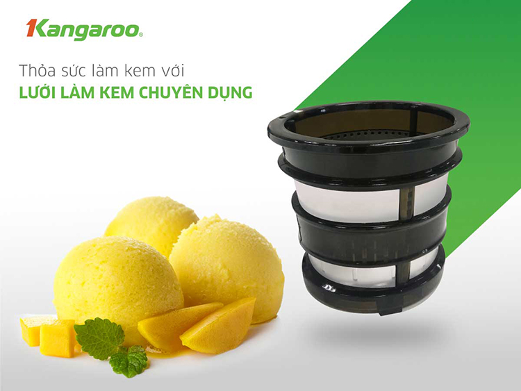 Bạn thỏa sức sáng tạo món ngon với chức năng làm kem hoa quả tiện lợi. Máy ép chậm Kangaroo KG180SJD được trang bị 2 loại lưới, trong đó 1 lưới chuyên dụng không lỗ để làm kem. Có ngay ly kem mát lạnh với thao tác đơn giản: cấp đông hoa quả, thay lưới và ép như bình thường.