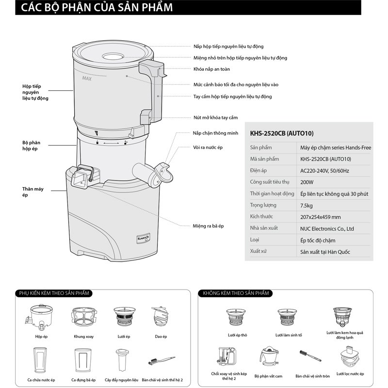 • Xuất xứ thương hiệu : Hàn Quốc     • Sản xuất tại : Hàn Quốc [ Made in Korea ] • Dung tích hộp chứa nguyên liệu: 3.0L  • Dung tích hộp ép : 500ml      • Công suất : 220-240V, 200W     • Tốc độ vòng quay : 50 RPM • Loại: Tốc độ chậm – Tự động cắt & ép – Cho tất cả nguyên liệu  • Hoạt động liên tục: 30 phút
