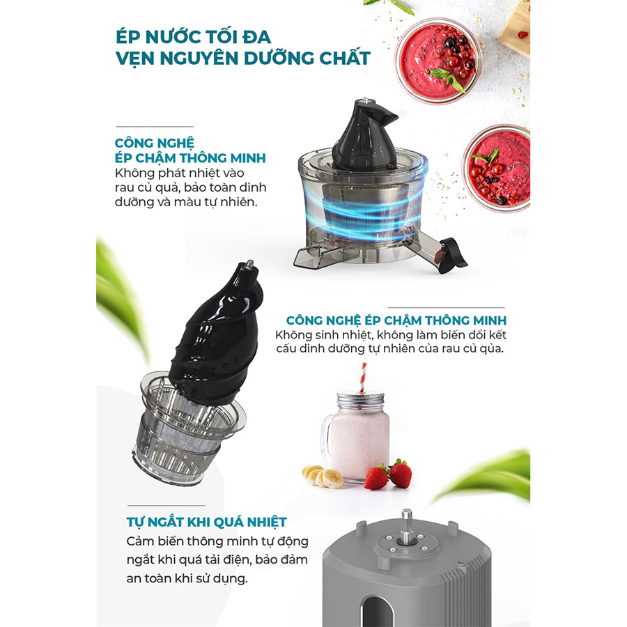 Công nghệ ép chậm thông minh với tốc độ 55 vòng/phút giúp ép nước tối đa, giữ trọn vitamin & hương vị tự nhiên