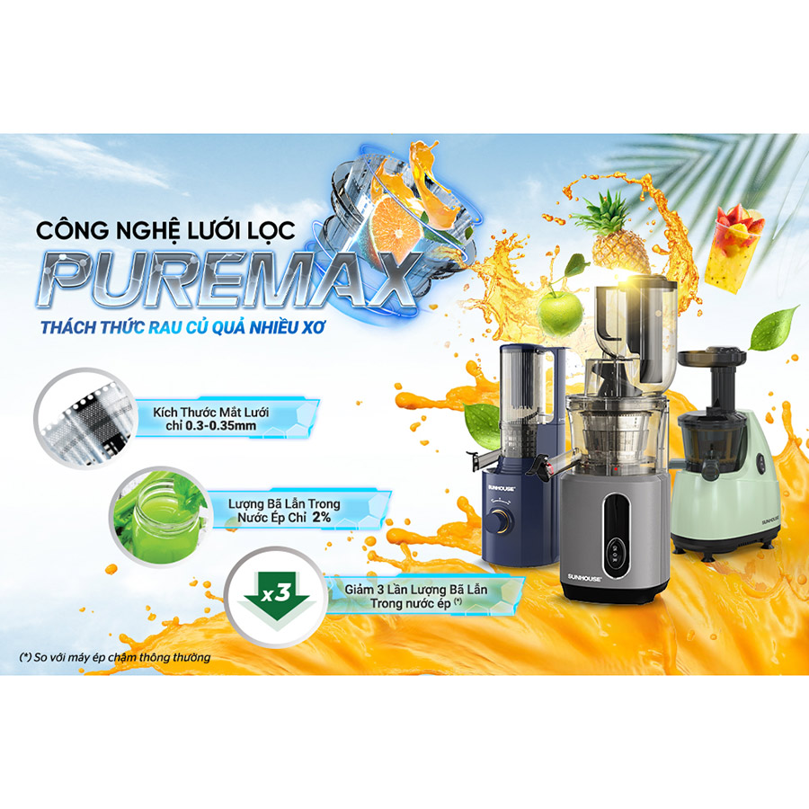 Mua tại TiktokMáy ép chậm SUNHOUSE SHD5503 với công nghệ lưới lọc PUREMAX với đường kính lưới lọc siêu nhỏ 0.35 mm, lọc sạch xơ bã, không gợn cặn