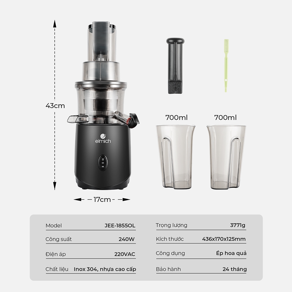✨Máy Ép Trái Cây Tốc Độ Chậm Elmich JEE-1855OL (Công Suất 240W, - Ống Tiếp Nguyên Liệu size Lớn) - Hàng chính hãng