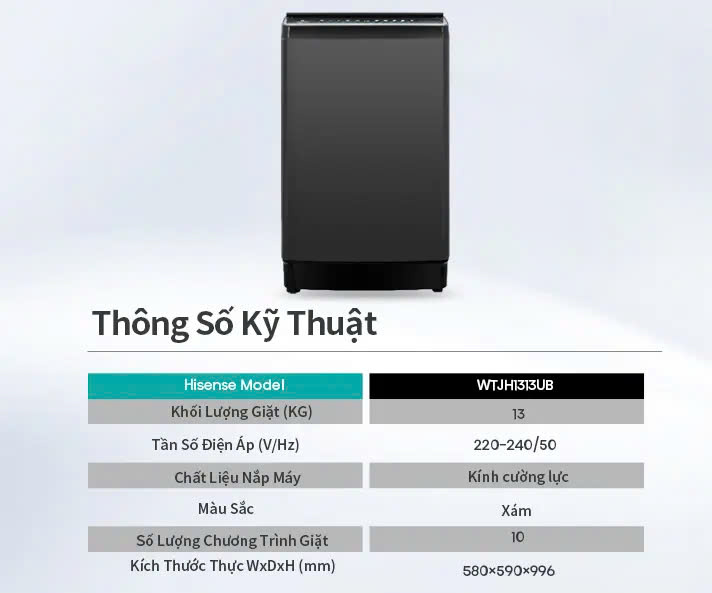 - Tần số điện áp: 220V-240V/50Hz Đặc điểm nổi bật của Máy Giặt Hisense 13kg WTJH1313UB