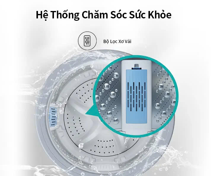 - Bộ Lọc Xơ Vải: Bộ lọc giúp ngăn ngừa các xơ vải khó nhìn thấy trên quần áo và dễ vệ sinh. Nó có thể tự động lọc xơ vải, sợi và các mảnh vụn khác trong quần áo, giúp quần áo của bạn trông sạch sẽ và mang đến cho bạn môi trường giặt giũ lành mạnh.