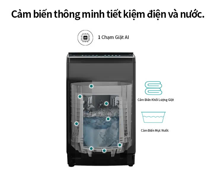 - Cảm biến thông minh tiết kiệm điện và nước: Trong trạng thái tắt nguồn, chỉ cần nhấn và giữ nút “Bắt đầu” trong 3 giây để bắt đầu chương trình Giặt AI. Máy giặt sẽ tự động cài đặt mực nước và thời gian giặt phù hợp với khối lượng quần áo, giúp việc giặt giũ trở nên dễ dàng hơn.