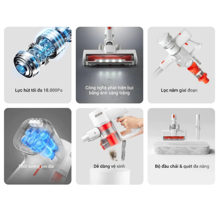 • Lực hút tối đa 18.000Pa*: Động cơ không chổi than tốc độ cao tích hợp cung cấp lực hút lên tới 18.000Pa cho phép dễ dàng loại bỏ các hạt, ngay cả ở những nơi khó tiếp cận.
