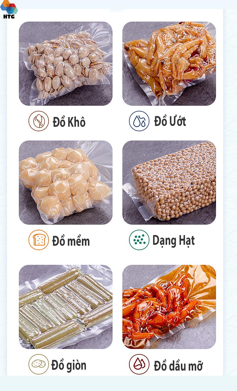 Hút chân không thực phẩm là một phương pháp tuyệt vời để lưu trữ nhiều loại sản phẩm, đặc biệt là thực phẩm, thịt, cá, rau, quả, nông sản, gạo, hạt điếu, tiêu, đậu… Các