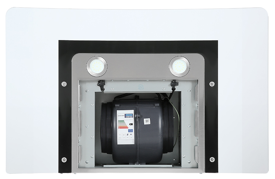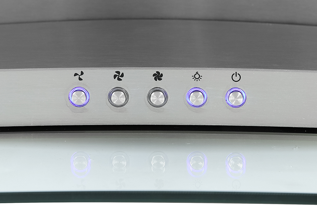 Chất liệu Inox - kính 6mm Điều khiển bằng phím cảm ứng Đèn báo sáng đang hoạt động Ống thoát Ø150mm Đèn Led tiết kiệm điện: 2Wx2 Bộ lọc 1 than hoạt tính và 2