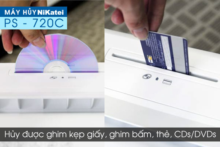 – Ngoài chức năng hủy giấy, máy tài liệu Nikatei PS-720C hủy được đĩa CD, ghim bấm, thẻ tín dụng, tính an toàn bảo mật rất cao.