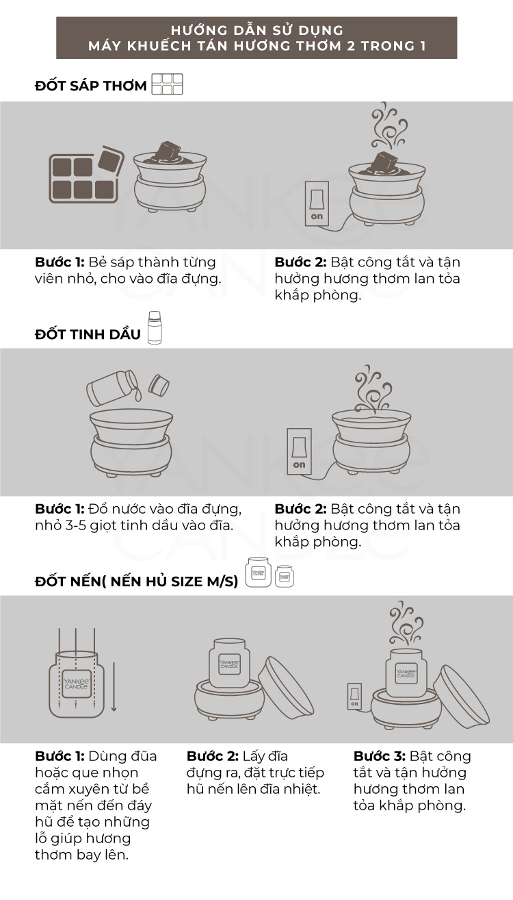 - Vừa làm đốt nến lãng mạn, vừa xông tinh dầu thơm ngát - Khuếch tán mùi thơm, tinh dầu thơm dễ chịu, khử mùi hôi triệt để, đặc biệt hiệu quả với không gian