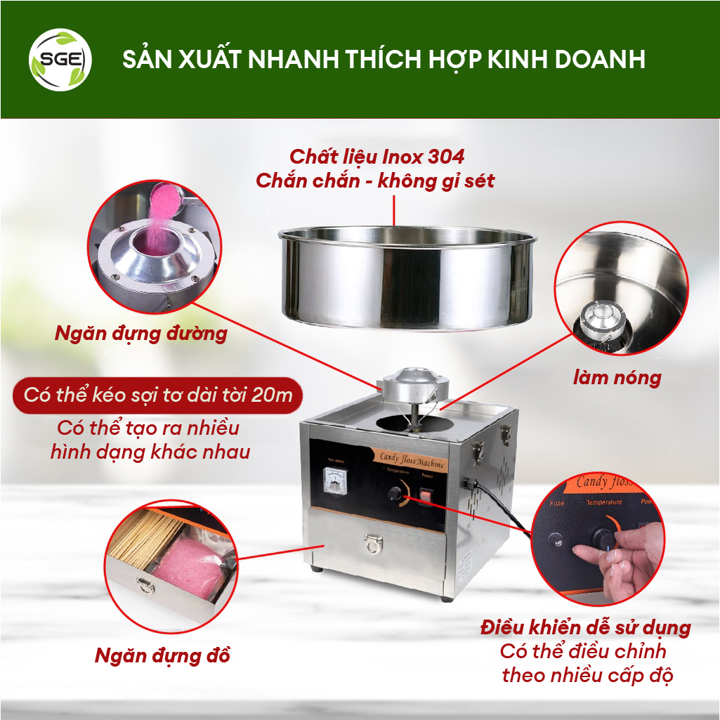 Máy kẹo bông Có thể làm kẹo bông mềm, sản xuất nhanh. Thích hợp để làm kẹo bông để bán bởi vì nó có năng lực sản xuất cao dùng nguyên liệu ít và sử dụng bền lâu. Máy cũng có thể sử dụng cho các event, sự kiện hay tổ chức hoạt động cho trẻ nhỏ do máy sử dụng được lâu dài.