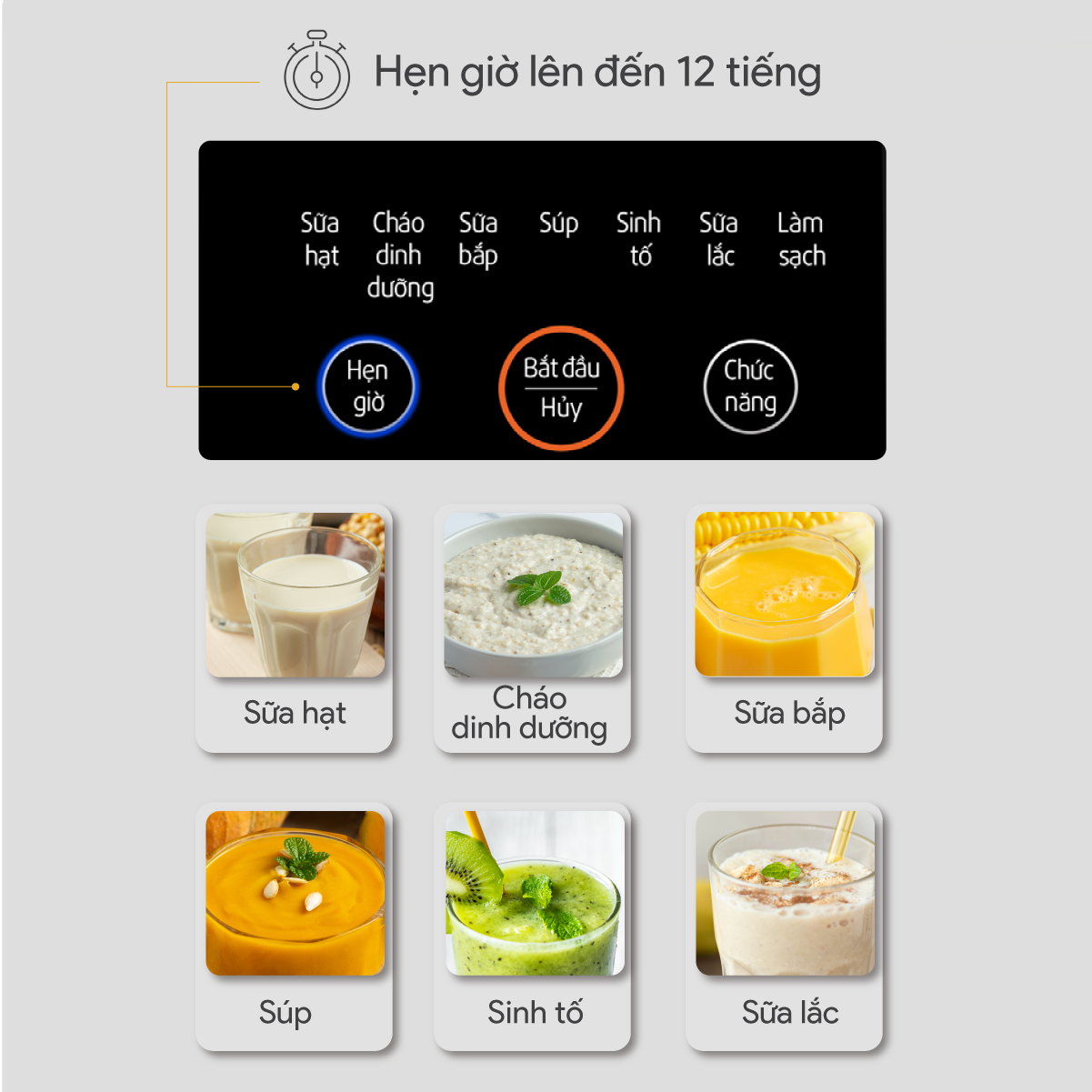 Ngoài ra, chế độ hẹn giờ lên đến 12 tiếng giúp bạn chủ động hơn trong việc xay nấu thực phẩm.