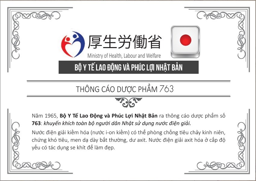 • Công dụng của nước điện giải ion kiềm   Có thể tham khảo ý kiến của Bác sĩ hoặc chuyên gia dinh dưỡng để được hướng dẫn loại nước uống phù hợp nhất cho cơ thể   Thông cáo dược phẩm 763 được Bộ Y Tế Nhật Bản ban hành từ năm 1965 khuyến khích người dân sử dụng nước điện giải ion kiềm