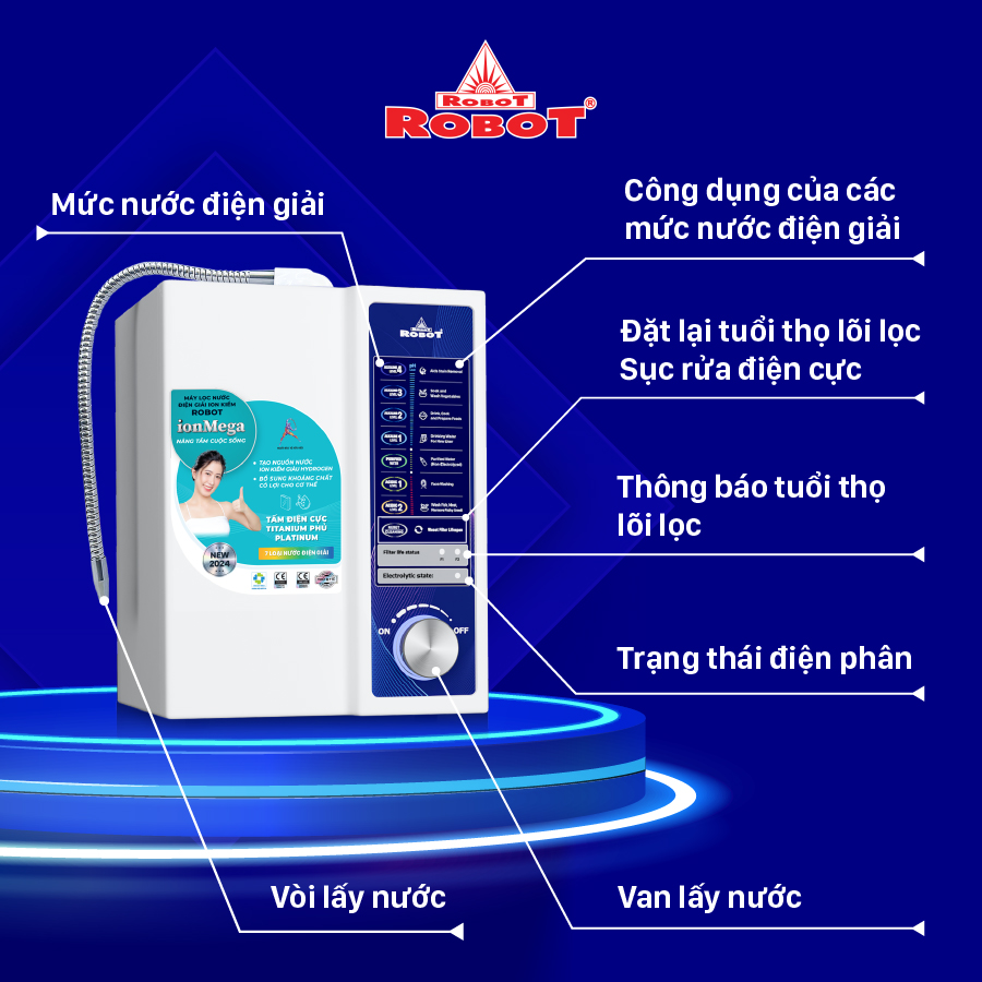 Máy lọc nước điện giải ion kiềm ROBOT ionMega 97 Máy lọc nước điện giải ion kiềm ionMega – thiết kế mới nhất, độc đáo siêu tiết kiệm với đầy đủ công năng của một máy điện giải ion kiềm đạt chuẩn quốc tế. ROBOT ionMega được thiết kế tối giản, nhỏ gọn, thao tác lấy nước trong một lần chạm, đáp ứng nguồn nước điện giải ion kiềm 24/24 tốt cho sức khỏe & sinh hoạt.   Chỉ số Hydrogen, ORP của nước tùy thuộc số tấm điện cực, đặc tính nguồn nước & “điều kiện đo trong phòng thí nghiệm chuyên nghiệp, đạt chuẩn”.