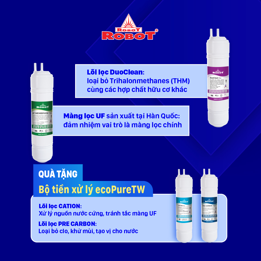 • Đặc biệt, trong thời điểm diễn ra chương trình khuyến mãi, Quý khách hàng sẽ được tặng thêm Bộ tiền xử lý nước EcoPureTW 2 lõi lọc sản xuất tại Korea trị giá 2.800.000đ. Sản phẩm tăng cường xử lý nước siêu sạch và giữ nguyên khoáng chất, nâng cao chất lượng của Máy lọc nước điện giải ion kiềm.