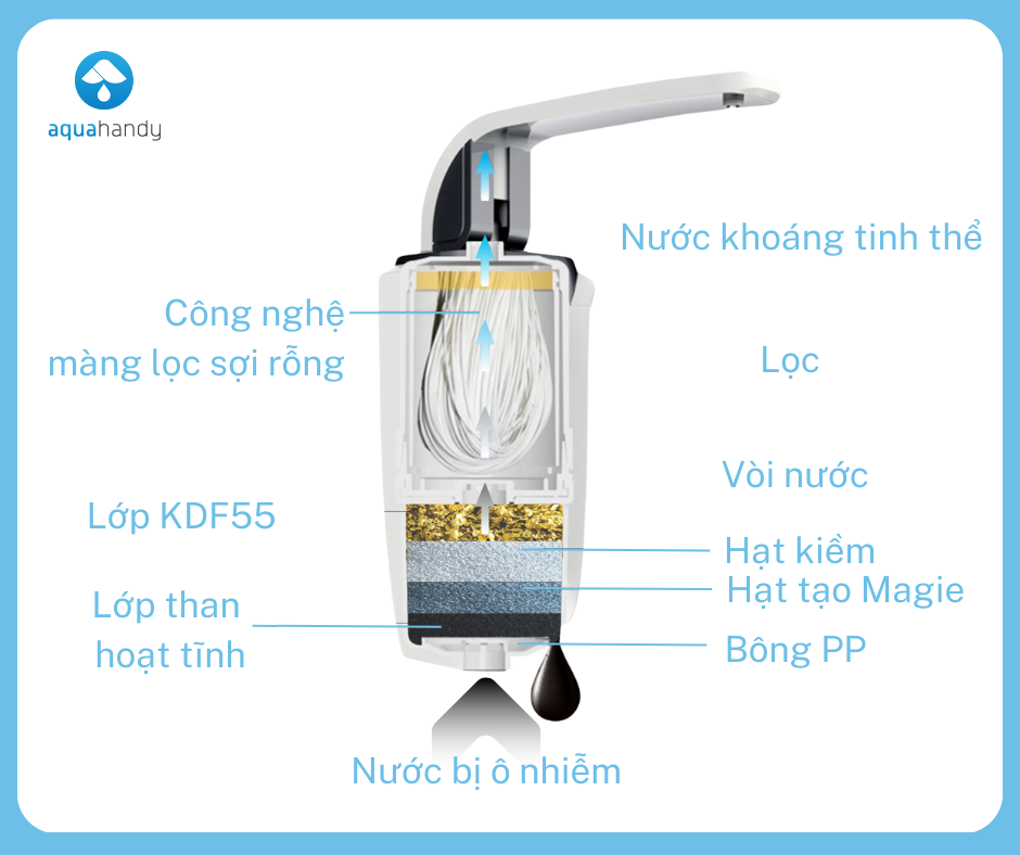 - Thiết kế lắp trực tiếp tại vòi nhỏ gọn, sang trọng cho gia đình hiện đại - Kiểm soát chất lượng nước và thông báo qua màn hình khi cần thay tiện lợi, tối ưu chi phí - Hệ thống lọc 5 bước tích hợp trong 2 lõi lọc (UF và GAC) loại bỏ tạp chất độc hại theo tiêu chuẩn quốc tế - Lõi lọc sợi rỗng UF công nghệ Nhật Bản đem lại nguồn nước sạch, tinh khiết - Chế độ chống bỏng nước nóng an toàn cho gia đình có trẻ em - Lõi lọc kháng khuẩn chống lại tái nhiễm khuẩn ngay trong bình chứa nước - Tên sản phẩm: Máy lọc nước iAquao Cơ thể bạn cần khoáng chất: Máy lọc nước iAquao oại bỏ 99,9% vi khuẩn, kim loại nặng, loại bỏ hoàn toàn các chất độc hại cho cơ thể như E.coli, Coliforms, Chì ... Giữ lại khoáng chất trong nước, giúp cân bằng độ pH. - Tại sao nên chọn iAquao - Thông số kỹ thuật - Sản phẩm: Máy lọc nước iAquao - Thiết bị lọc nước thông minh iAquao - Nhãn hiệu: AquaHandy - Công suất lọc: 180L/H ============================== Tất cả sản phẩm tại AquaHandy đều đạt các chứng nhận đảm bảo sức khỏe người sử dụng từ cơ quan chức năng. Tôn chỉ của chúng tôi là mang tới sức khỏe cho mọi gia đình tại Việt Nam thông qua nguồn nước khoáng tinh thể. Sản phẩm máy lọc nước iAquao chính hãng AquaHandy được bảo hành 24 tháng trên toàn quốc.
