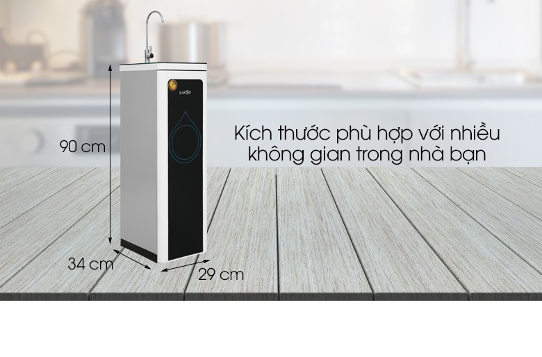 Kiểu dáng tủ đứng thon gọn tô điểm cho không gian hiện đại hơn Máy lọc nước RO Hydrogen nóng nguội 10 lõi Karofi KAH-D10 có kiểu dáng tủ đứng thon gọn, tiết kiệm diện tích