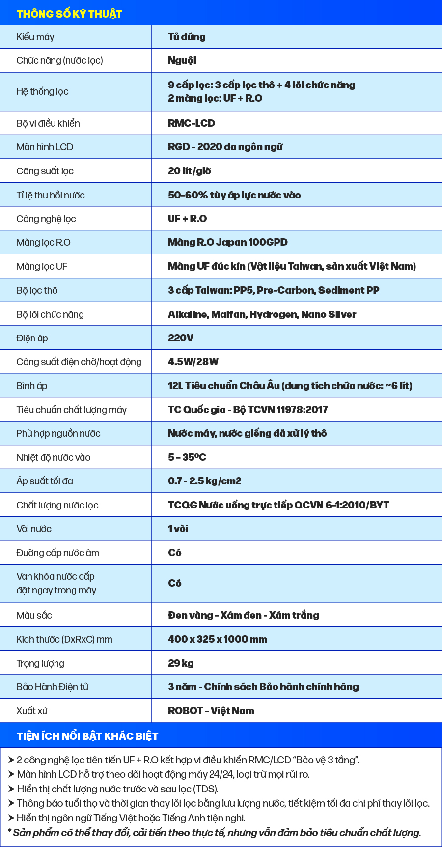 • Công nghệ RMC – LCD độc quyền, biết được chất lượng nước trước & sau lọc     Bộ vi mạch RMC-LCD thông minh thiết kế phát minh của ROBOT, mọi chi tiết vận hành máy được hiển thị trên màn hình LCD, cảnh báo mọi rủi ro cho người sử dụng   Tuổi thọ lõi lọc được tính theo lưu lượng nước sử dụng, không tính theo thời gian ghim điện như các máy thông thường, tiết kiệm tối đa chi phí thay lõi lọc