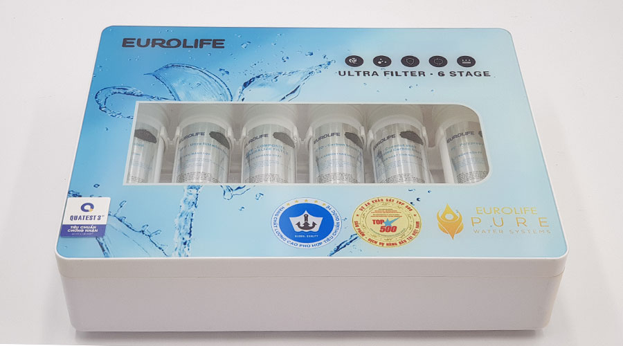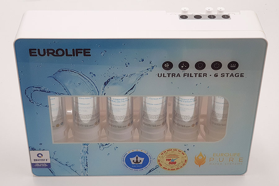- 6 cấp độ lọc tiên tiến Máy bao gồm 6 cấp độ lọc : PP, GAC, CTO, UFF, COM, T33. Tăng cường khả năng diệt khuẩn lên đến 100%, loại bỏ rỉ sét, kim loại nặng, các tạp chất, hóa chất ... trong nguồn nước. Nước lọc qua máy UF của Eurolife đạt tiêu chuẩn nước uống đóng chai : Theo QCVN-6-1:2010/BYT do Quatest 3 xét nghiệm và so sánh. TÍNH NĂNG LỌC NƯỚC Loại bỏ tạp chất, thành phần hóa học, ô nhiễm, độc hại, clo, diệt khuẩn, vi sinh… Loại bỏ kim loại nặng như: chì, cadmium, đồng .... Làm mềm nước, thay đổi cấu trúc khoáng dễ hấp thụ hơn cho cơ thể con người (nằm trong tiêu chuẩn cho phép) phòng tránh các bệnh thiếu canxi, thiếu khoáng, sỏi thận, tắc nghèn đường ruột, cải thiện vị nước, thức ăn. Hấp thụ asen, amoni, các dạng khí hoá lỏng tốt hơn nhờ cơ chế lọc hấp thụ. Tiêu diệt được 99,9% vi khuẩn vi khuẩn, vi rút và mầm bệnh có hại. 1- LÕI PP (Polypropylene Filter)