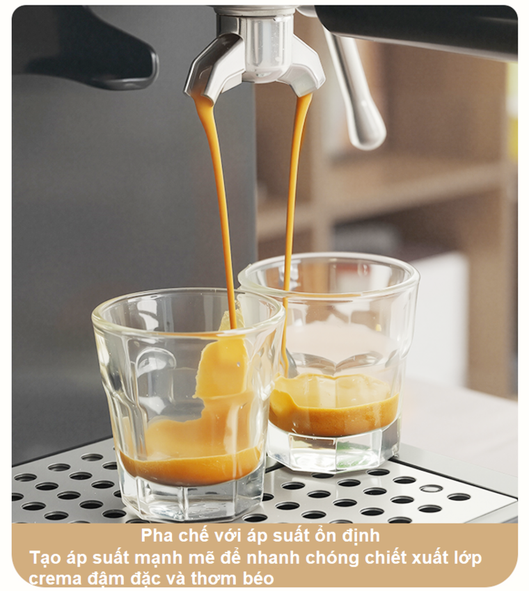 Bơm Italy áp suất 20 bar tạo ra tách cà phê đậm đà Công suất 1400W, điện áp 220-240V/50Hz-60Hz Gia nhiệt nhanh chóng, đảm bảo cà phê chiết xuất với nhiệt độ lý tưởng nhất