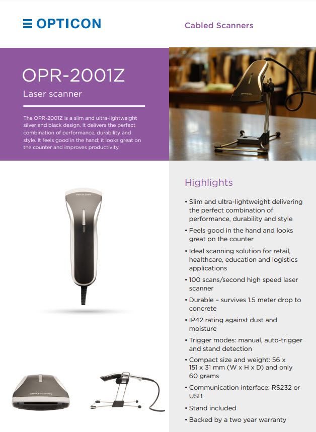 Tổng Quan Sản Phẩm Máy quét mã vạch OPTICON OPR-2001Z là máy quét mã vạch cầm tay laser tốc độ cao, được thiết kế mỏng, gọn, nhẹ với kiểu dáng đẹp, mang lại trải nghiệm quét mượt mà,